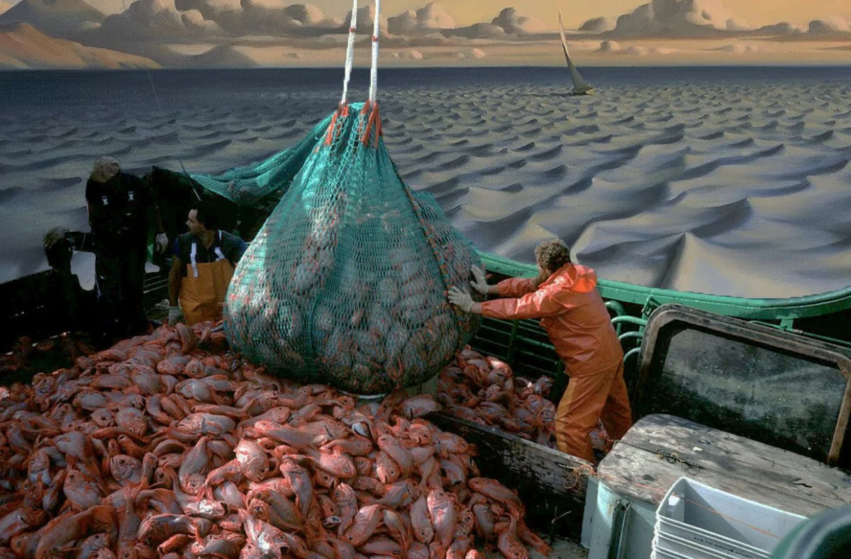 ‘Industrial Fisheries of Orange Roughy’ © Australian Fisheries Management Authority; ‘Ripple on the Ocean’ (n.d.) by Vladimir Kush, edited by Francesca Norrington (2023)